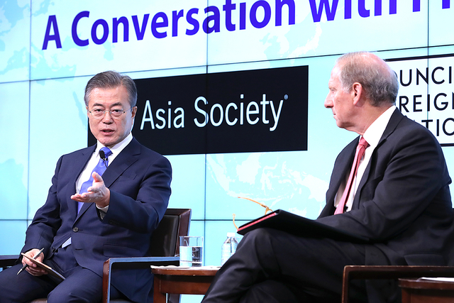 ▲ CFR・KS・AS 공동주최 연설에 이어 질의응답을 하고 있는 문재인 대통령 ⓒ 청와대사진기자단
