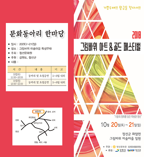 강원 정선군은 오는 20~21일 이틀간 정선 화암면 그림바위 미술마을 일원에서 ‘가을의 정취를 담은 특별한 정선’이란 부제로 ‘2018 그림바위 아트& 골드 페스티벌'을 개최한다.