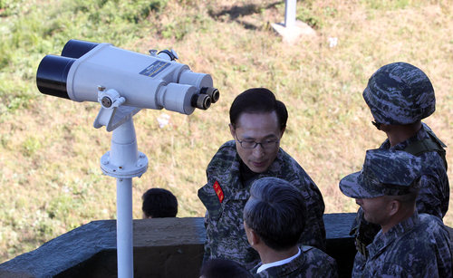 | ▲ 18일 서해 최북단 연평도 연평부대를 방문한 이명박 대통령이 한 OP(관측소)에서 망원경으로 북측지역을 관측하던 중 설명을 듣고 있다. 현직 대통령이 연평도를 방문한 것은 처음이다.ⓒ연합뉴스 |