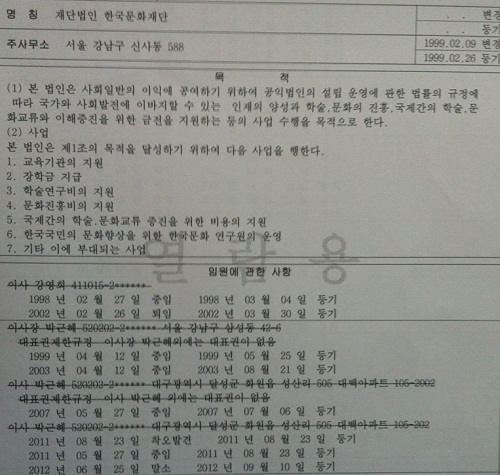 한국문화재단은 박근혜 후보의 '숨겨진 아킬레스건'으로 통했었다. 지난 2007년 한나라당(현 새누리당) 대선 경선 당시에도 문제가 됐었는데, 당시 이명박 후보 캠프는 "최태민의 사위이자 박근혜 후보의 비선 라인 비서실장 격인 정윤회 전 보좌관이 관리하고 있다"는 의혹을 제기하기도 했다.