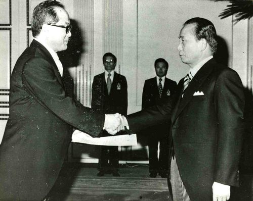 | ▲ 박정희 전 대통령의 통치자금 관리인 격이었던 김정렴 전 청와대 비서실장이 79년 박정희 전 대통령으로부터 79년 2월 7일 주일대사 신임장을 받고 있는 모습 ⓒ연합뉴스 |