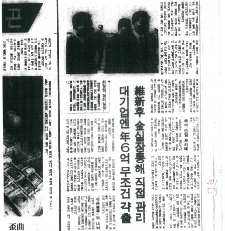 "나는 정치 성금 대상 기업을 엄선하고 그 기업주를 청와대 신관에서 만나 기업이 마음대로 쓸 수 있는 판공비와 기밀비 중 일부를 민주주의의 필요악적 비용인 정치 자금으로 도와줄 것을 요청하면서 일체 반대 급부는 없다는 점을 명확히 했다. 성금은 최고 1억 원, 최하 1000만 원 범위 내에서 각 기업의 사정에 따라 자율적으로 정해달라고 부탁했다. 내가 부탁한 스물 대여섯 기업주들은 모두 기꺼이 승락하고 협조를 확약해 주었다."