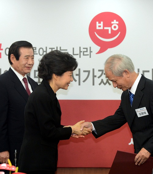 | ▲'반 박정희 투쟁'의 상징이었던 김중태 부위원장이 박근혜 후보로부터 임명장을 받고 고개를 숙이고 있다. ⓒ뉴시스 |