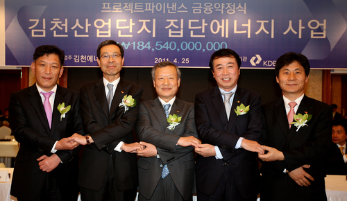 | ▲ 산업은행은 25일 출자자인 SK E&S, 코오롱건설 등과 김천산업단지 열병합발전소 프로젝트파이낸스(PF) 금융약정에 서명했다고 밝혔다. 금융기관 가운데는 현대해상화재보험 등 8개사가 참여했다. 왼쪽부터 안효상 김천에너지 대표이사, 문덕규 SK E&S 대표이사 , 공세일 산업은행 부행장, 안병덕 코오롱건설 대표이사, 배명호 김천에너지 대표이사. 2011.4.25 ⓒ연합뉴스 |