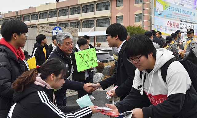 최 군수는 이날 시험장으로 들어오는 지역의 수험생들과 일일이 손을 잡아주며 응원의 메시지를 전달하고 용기를 북돋아 주었으며, 또한 수험장을 찾은 학부모들을 격려하며 수능 대박을 응원했다.