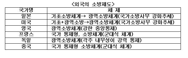 외국은 어떨까. 대부분 한국과 같은 광역 소방 체제를 유지하고 있지만, 일본은 국가 사무가 강화되는 추세이고 영국도 중앙 통제가 강력하게 이뤄진다고 한다. 미국과 독일은 지방정부의 예산 권한 등이 막강하기 때문에 한국의 '지방직'과 개념이 아예 다르다. 정기신 교수는 "미국의 경우 각 주정부가 소방 업무를 관장하는데, 주가 각각의 '국가' 역할을 하는 것이나 마찬가지이기 때문에 한국의 지자체 개념과 비교할 수 없는 부분이 있다"고 설명했다. 사실상 국가직이나 마찬가지로 볼 수 있다는 말이다.