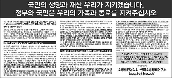 지난 1월 21일, 일부 일간지에 "국민의 생명과 재산 우리가 지키겠습니다. 정부와 국민은 우리의 가족과 동료를 지켜주십시오"라는 제목의 광고가 실렸다. 현직 소방관이 주축이 돼 만들어져 현재 8000여 명의 회원을 거느린 소방발전협의회가 한국소방정책연구소와 함께 실은 의견 광고였다. 5000원 남짓의 밥값을 아껴 십시일반 광고비를 모으고, 인증샷을 찍어가며 광고를 만들었다.