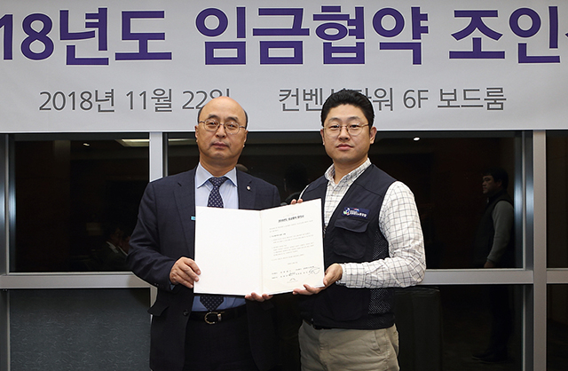강원랜드 노·사는 지난 22일 오후 하이원 그랜드호텔 연회장에서 문태곤 대표이사와 송인태 노조위원장을 비롯한 교섭위원들이 참석한 가운데 2018년 임금교섭 합의 조인식을 개최했다고 23일 밝혔다.