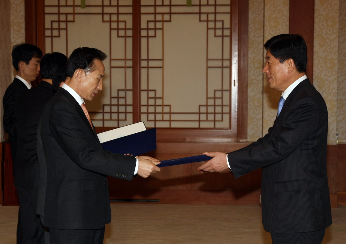 | ▲ 2009년 2월, 이명박 당시 대통령이 원세훈 국정원장에게 임명장을 수여하고 있다. ⓒ청와대 |