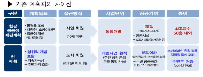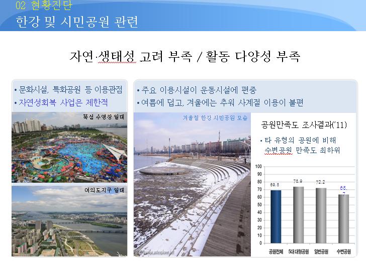 서울시는 이어 "한강변 재건축 사업을 사업의 관점으로 해소하려 함에 따라 통합 개발, 기부 채납률 과다 등에 의한 주민 반대로 사업 실행이 불가능했고, 과도한 높이(50층 내외 초고층)와 용적률(330% 수준) 과다, 기부 채납의 적절성 등 사회적 논란이 발생하기도 했다"고 지적했다. 서울시는 또 "한강 전체에 대한 2007년의 정책적 시도(한강 르네상스 마스터플랜)가 장기 계획으로 이어지지 못했고, 그 외에는 (경관 등) 특정 주제(에 한정된) 관점으로 접근해 종합적 도시 관리에 한계가 드러났다"고 평가했다.