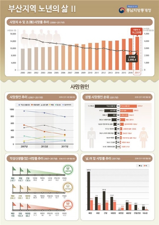 부산지역 사망자 수는 1만6220명으로 전년 대비 780명 증가했고 인구 10만 명당 사망자 수는 2998.4명으로 전년 대비 5.7명 상승했다.
