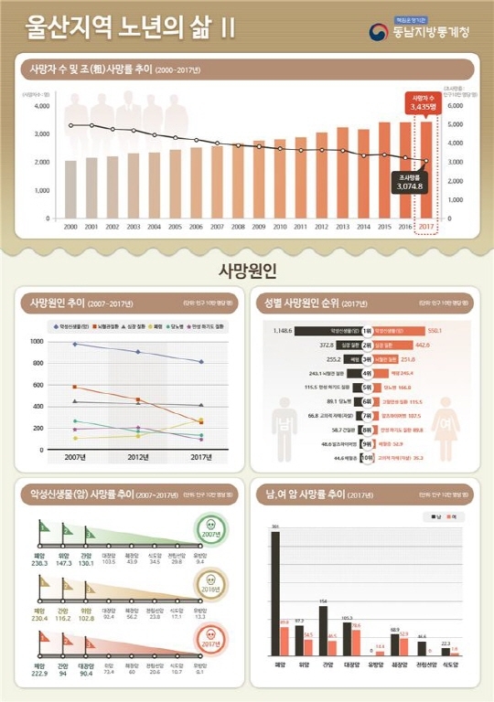 동남지방통계청이 29일 발표한 '부산·울산지역 노년의 삶 : 사망원인·건강·복지(65세 이상 인구 대상)'에 따르면 사망원인 1위는 암(폐암, 간암, 대장암, 위암, 췌장암 순)으로 나타났다.