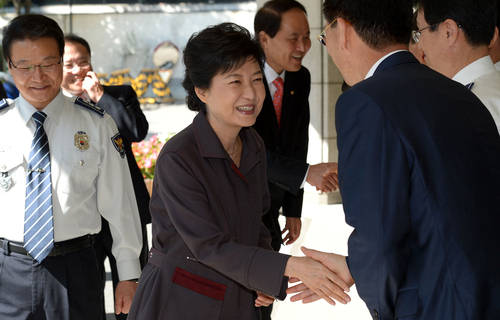 | ▲ 지난해 10월 1일, 당시 새누리당 대선 후보이던 박근혜 대통령이 서울지방경찰청을 방문해 김용판 서울지방경찰청장 등 관계자들과 기념 촬영을 마친 뒤 인사하는 모습. ⓒ연합뉴스 |