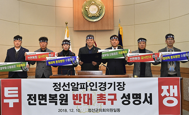 강원 정선군의회(의장 유재철)는 10일 의회 본회의장에서 환경부와 산림청에서 주장하고 있는 정선 알파인경기장 완전복원에 대해 강력하게 반대하고 나섰다.