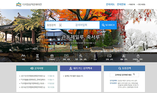 디지털삼척문화대전 홈페이지 첫 메인화면은 공지사항과 내가 쓰는 삼척백과, 디렉토리 분류, 추천 콘텐츠, 삼척 한눈에 보기, 기획영상으로 구성돼 있으며 화면 하단의 관광안내 리플릿을 통해 삼척지역 관광명소도 확인 가능하다.