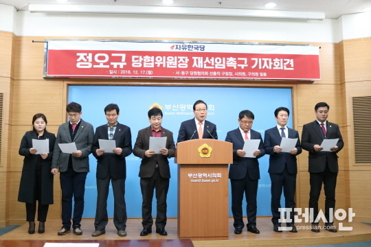 한국당 소속 부산 서·동구 당원협의회(공한수 서구청장, 김진홍·최도석 부산시의원, 공상조·허승만·강석진·이상욱·김선경 구의원)는 17일 오후 부산시의회 3층 브리핑룸에서 기자회견을 열고 "정오규 당협위원장 살생명단을 즉각 철회하고 재선임할 것을 촉구한다"고 밝혔다.