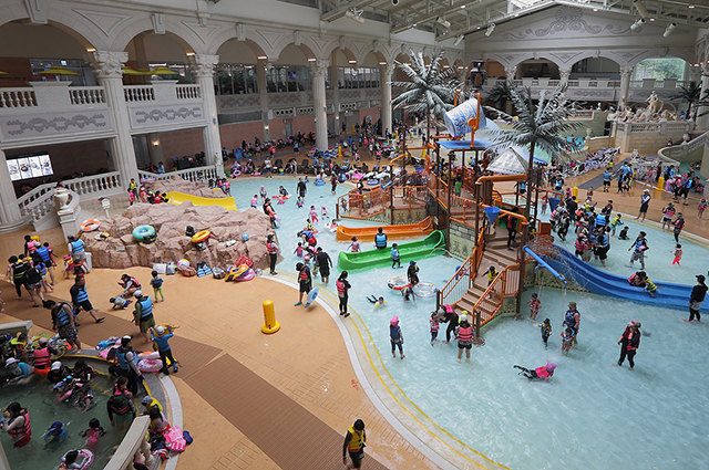 워터월드 실내존에서는 바디 슬라이드, 튜브슬라이드, 스윙스타 등 짜릿한 즐거움을 선사하는 3종의 슬라이드와 함께 베베풀, 아쿠아플레이, 둥둥리버 등 아이들과 함께 즐길 수 있는 시설도 충분하다.