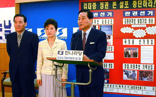 | ▲ 박근혜 대통령은 야당 부총재 시절 안기부(1999년 1월 국정원으로 개명) 등의 정치 개입 이슈를 제기한 적이 있다. 박근혜 대통령의 뒤쪽에 있는, '국정원 선거 개입' 의혹을 제기하는 한나라당 선전물이 눈에 띈다. 국회의원 총선거가 한창이던 지난 2000년 4월 6일 오전 한나라당 여의도 당사에서 서청원 당시 선대본부장이 박근혜 당시 부총재 등과 함께 기자회견을 열고 있다. ⓒ연합뉴스 |
