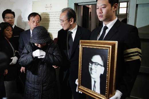 | ▲ 장준하 선생이 수감됐던 감옥을 둘러보고 나온 유가족. 장남 장호권 씨(가운데), 그 왼쪽이 고인의 부인 김희숙 여사. ⓒ프레시안(최형락) |
