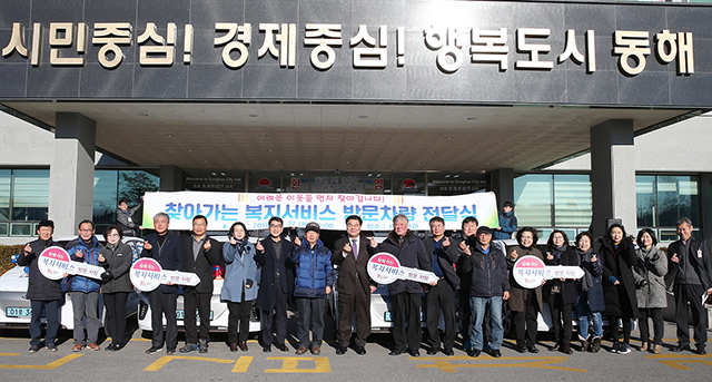 강원 동해시(시장 심규언)는 동 지역사회보장협의체 위원과 동장을 비롯한 직원들이 참석한 가운데 지난 27일 시청 현관에서 송정·부곡·묵호·망상 4개 동 주민센터에 ‘찾아가는 복지서비스 방문 차량’ 전달식을 가졌다.