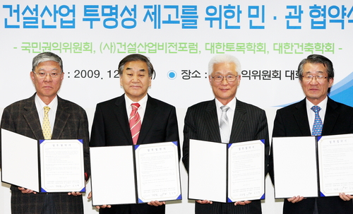 | ▲ 국민권익위원회는 2009년 12월 15일 건설산업비전포럼, 대한토목학회, 대한건축학회와 함께 우리나라 건설 산업 분야 청렴도 제고를 위해 함께 노력하기로 하고 업무 협약(MOU)을 체결했다. 왼쪽부터 편종근 대한토목학회장, 이재오 국민권익위원장, 장승필 건설산업비전포럼 대표, 손장열 대한건축학회 회장. '대운하 전도사'인 이재오 의원과 나란히 선 장승필 교수의 모습이 이채롭다. ⓒ연합뉴스 |