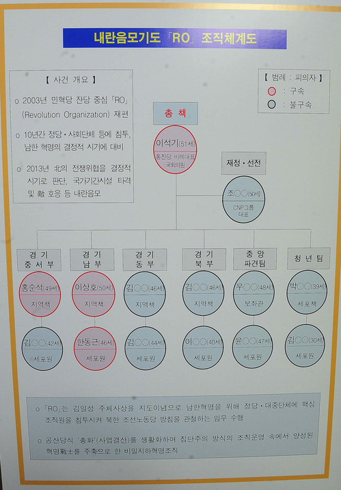 | ▲ 26일 오후 경기도 수원지검 대회의실에서 검찰이 공개한 통합진보당 이석기 의원이 총책인 'RO' 조직체계도. 2013.9.26 ⓒ연합뉴스 |