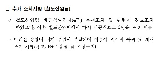 특히 철도산업팀 '민영화비밀TF'에 대해 "철도산업팀 비공식 파견자(4명) 복귀 조치 및 관련자 경고 조치 하였으나, 이후 철도산업팀에서 다시 비공식으로 2명을 파견 받았다"고 인정하며 "이러한 상황이 자체 점검시 적발되어 비공식 파견자 복귀 및 제재 조치를 시행"했다고 밝혔다. 다만 징계를 받은 2명이 누구인지에 대해 국토부는 확인해주지 않았다.