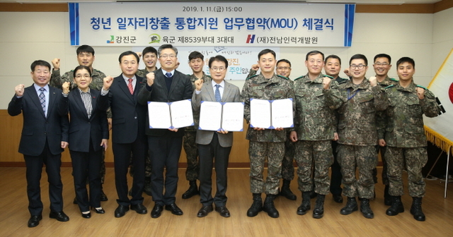 강진군은 지난 11일 청년장병들을 위한 일자리 지원 방안으로 육군 제8539부대 연대 직할부대, 강진대대, 전남인력개발원과 ‘청년일자리창출 통합지원 업무협약’을 체결했다고 밝혔다.