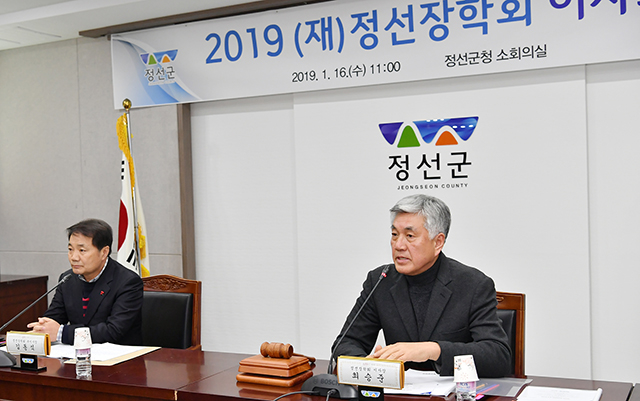 강원 정선장학회는 16일 정선군청 소회의실에서 최승준(정선군수) 이사장, 이사, 관계자 등이 참석한 가운데 미래인재 육성을 위한 2019년 정선장학회 이사회를 개최했다.