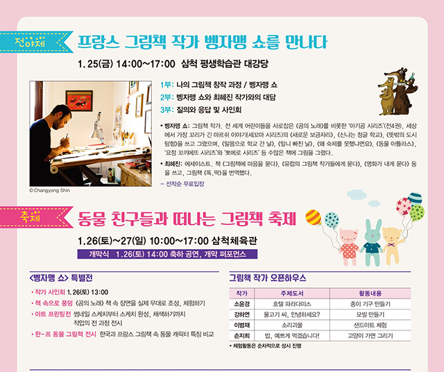 벵자맹 쇼와의 만남은 25일 오후 2시 삼척평생학습관 대강당에서 진행되며, 그림책 창작 과정을 듣는 시간과 함께 질의와 응답 및 사인회 등으로 참석자들에게 즐거움을 선사할 예정이다.