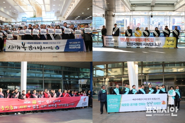 민주당 부산시당은 1일 오후 1시 김해공항 국내선 청사에서 전재수 부산시당위원장, 오거돈 부산시장, 박인영 부산시의회 의장, 박재호·윤준호 의원 등 주요 당직자들이 참석한 가운데 설 귀성길 인사를 진행했다.