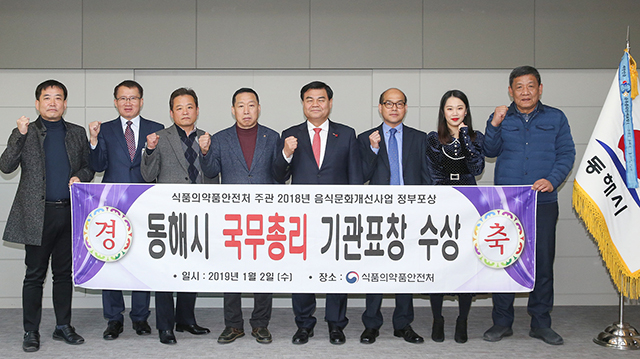 동해시는 지난해 전국 자치단체를 대상으로 평가한 ‘2018년 음식문화 개선사업 평가’에서 위생적이고 안전한 음식 문화 정착 등 지역 특색에 맞는 음식문화 개선과 위생 수준 향상을 위한 다양한 사업을 선도적으로 추진한 공로를 인정받아 2017년 식품의약품안전처장상에 이어 국무총리상 기관표창을 수상했다.