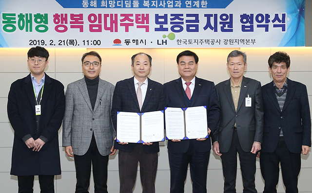 동해시(시장 심규언)와 한국토지주택공사 강원지역본부 주거복지사업단(단장 권세연)은 최근 동해 희망디딤돌 복지사업과 연계한 다가구 매입 임대 보증금 지원 시범 사업인 ‘동해형 행복 임대주택 보증금 지원’ 협약식을 체결했다.