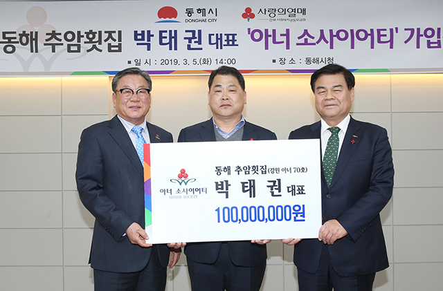 강원도 사회복지공동모금회 주관으로 열린 이날 회원 가입식에는 추암횟집 박태권 대표가 동해시에서는 두 번째로 ‘아너 소사이어티’로 이름을 올렸다.