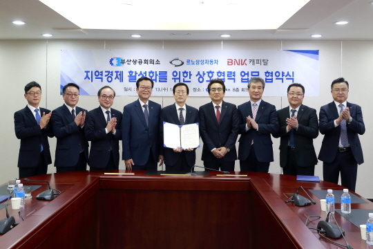 BNK캐피탈과 부산상공회의소, 르노삼성자동차는 13일 오후 '지역경제 활성화를 위한 상호협력 업무 협약'을 체결했다.