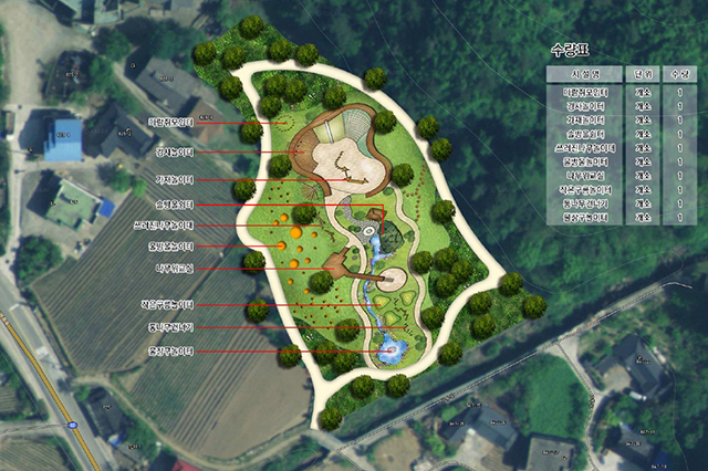 ‘흙, 숲, 물, 나무열매’ 등 자연을 벗 삼아 다양한 체험과 모험활동을 즐길 수 있도록 생태 스토리텔링을 적용한 시설물과 친환경 재료로 자연·모험·놀이·개방 4개의 공간으로 생태체험공간을 조성해 자녀와 부모 등 지역주민에게 놀이와 커뮤니티 공간을 제공할 예정이다.