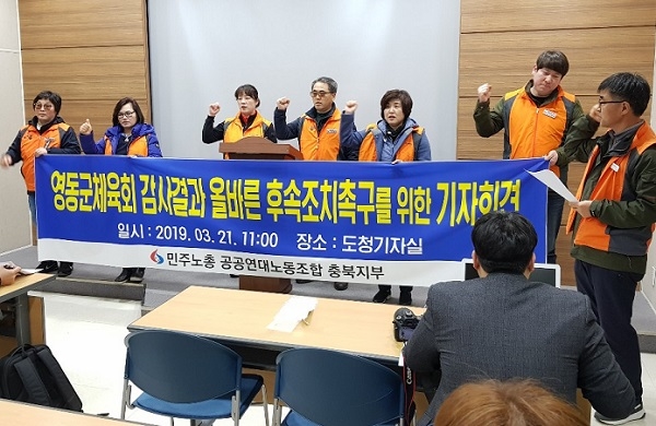 영동군체육회 근무자들이 소속된 공공연대노동조합 충북지부는 21일 충북도청에서 기자회견을 열고 “영동군체육회내에서 벌어진 공금횡령 등 비리에 대해 영동군이 감사를 벌여 사실이 확인됐으나 징계조치 등이 이뤄지지 않았다”며 “충북도의 재 감사를 촉구한다”고 밝혔다.