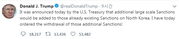 트럼프 대통령은 22일 자신의 트위터를 통해 "북한에 대한 기존 제재에 더해 더 큰 규모의 제재가 추가될 것이라고 오늘 재무부가 발표했다"며 "나는 오늘 이러한 추가제재 철회를 지시했다!"고 밝혔다.