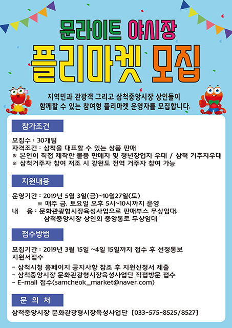 삼척시 관계자는 “지역주민과 관광객, 상인들이 함께할 수 있는 참여형 플리마켓 운영으로 삼척중앙시장이 활성화됨은 물론이고 특색있는 전통시장으로 발돋움할 것으로 기대된다”고 밝혔다.