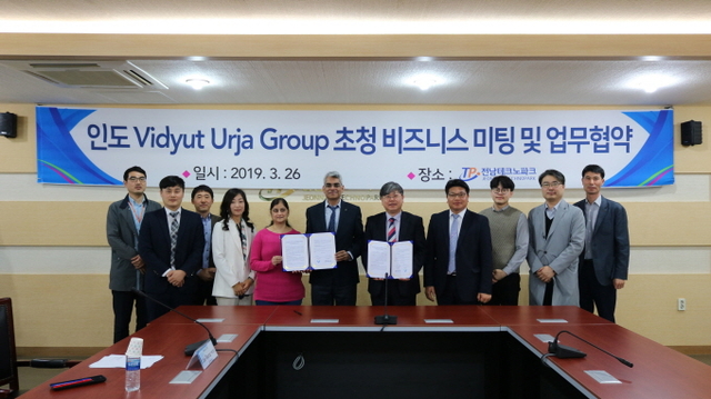 (재)전남테크노파크(원장 유동국)는 인도 비듀뜨 우르자그룹(VIDYUT UTJA) 모한 보롤레(MOHAN BOROLE) 회장을 초청하여 전남 중소 수출기업 활성화를 위한 업무협약을 26일 전남테크노파크 2층 전용회의실에서 체결했다.