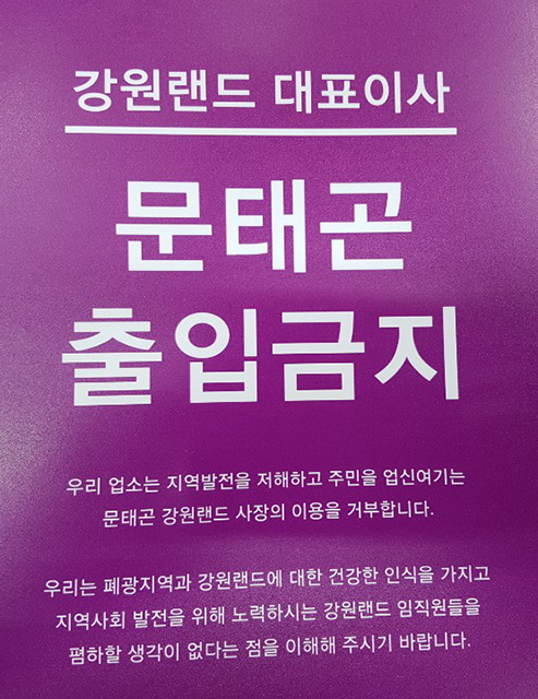 50여 개 사회단체는 성명서를 통해 “지난 1일 문태곤 강원랜드 사장에 대한 지역상가 출입금지 안내문이 부착된 첫날 돈 몇 푼이면 지역주민을 회유할 수 있다고 믿는 강원랜드의 현실에 할 말을 잃었다”고 주장했다.