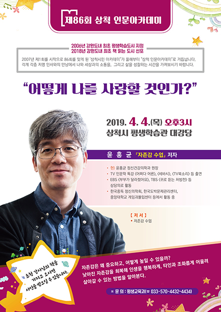 이날 인문아카데미는 ‘자존감 수업’의 저자 윤홍균 강사를 초청해 ‘어떻게 나를 사랑할 것인가?’라는 주제로 강연한다.