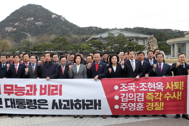 한국당은 9일 청와대 앞에서 현장 의원총회를 열고 두 장관 임명 강행에 대한 문재인 대통령의 사과와 조국 민정수석 경질 등 청와대 개편을 요구했다.