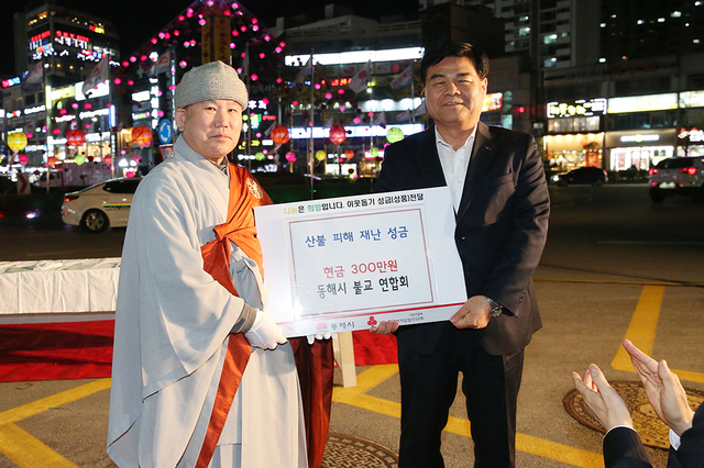 ▲지난 12일 동해시 천곡로터리에서 열린 ‘불기 2563년 부처님 오신날 봉축 점등식’에서 불교연합회는 지난 5일 강원산불로 인한 이재민들을 돕기 위한 성금을 심규언 동해시장에게 기탁하고 있다. ⓒ동해시