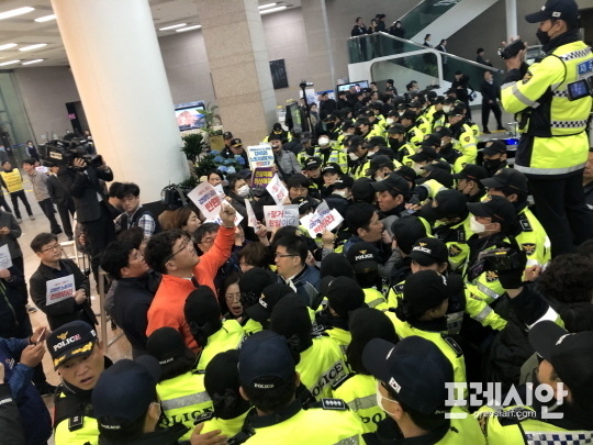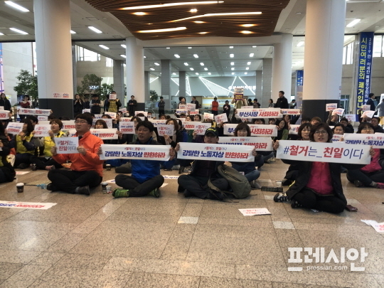 30분가량 농성을 펼치던 이들은 결국 공무원과 경찰에 의해 1층으로 강제 해산됐으며 청사 1층 로비에서 오거돈 시장의 사과와 노동자상 철거 책임자 처벌 등을 요구하면서 연좌 농성을 이어가고 있다.
