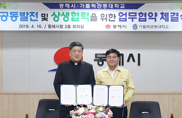 동해시(시장 심규언)가 16일 가톨릭관동대학교(총장 황창희)과 양 기관의 공동 발전 및 상생 협력을 위한 관학 업무협약을 체결했다.