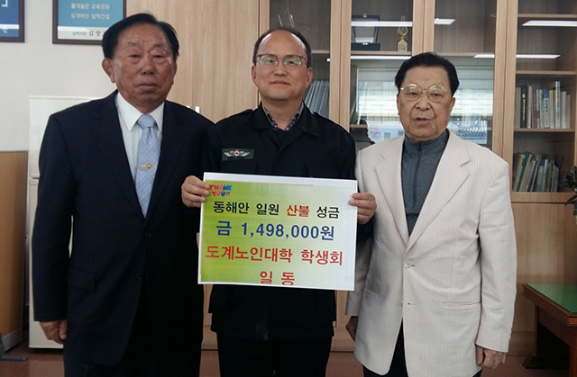 아울러, 도계노인대학 학생회에서도 지난 17일 도계읍 행정복지센터를 방문해 학생회장 배선태씨를 비롯한 300명이 십시일반 모은 성금 149만 8000원을 산불피해 성금으로 기탁했다.