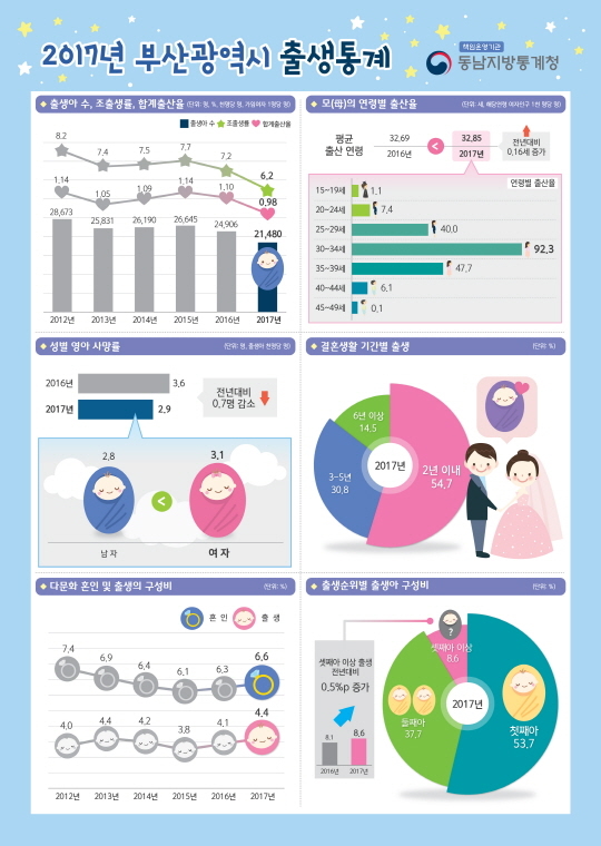 지역별로 보면 농어업분야가 많은 강서구가 유일하게 출생아 수가 증가하면서 합계출산율이 1.83명으로 가장 많았고 비슷한 성향을 보이는 기장군 1.46명, 북구 1.11명 등으로 상위권을 형성했다.