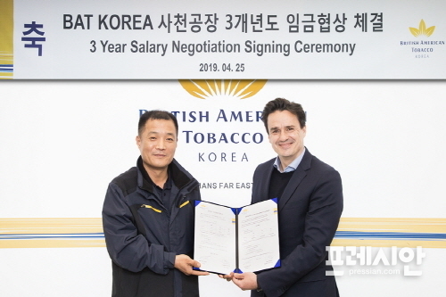 브리티쉬아메리칸토바코코리아제조㈜(BAT코리아)가 지난 25일, BAT코리아 사천공장 노동조합(BAT노동조합)과의 2019 임금 및 단체협상 교섭을 타결하고 임단협 조인식을 개최했다.