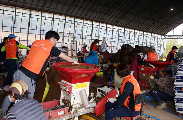 28일 강원랜드 사회봉사단 직원 20여 명은 이번 산불로 피해를 입은 고성군 토성면 원암리 인근 농가를 찾아 벼 육묘 1만 2000여 상자의 모판 작업을 도왔다.